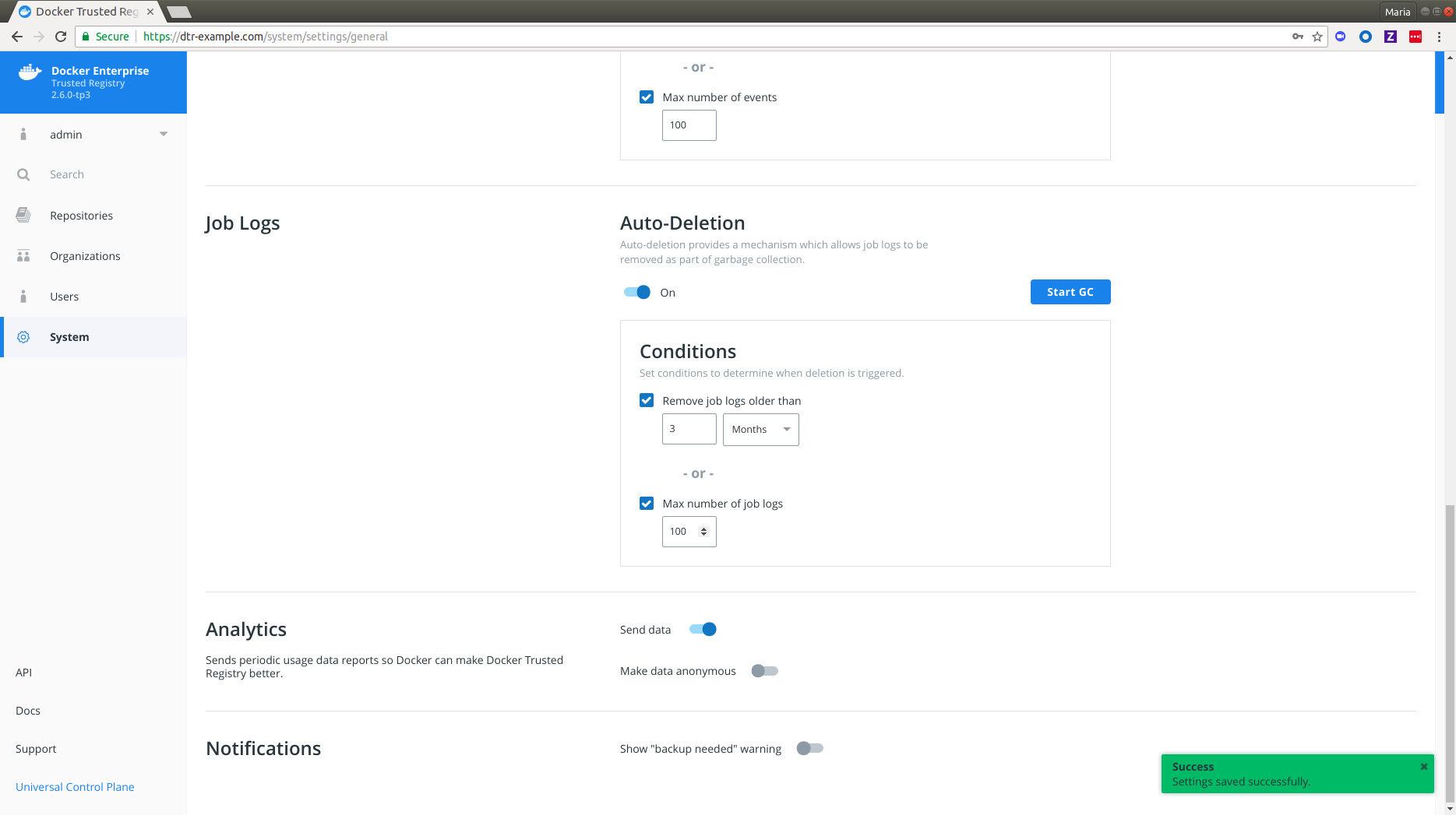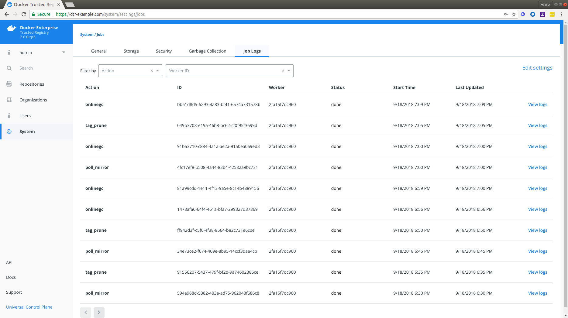 Docker Trusted Registry has a global setting for auto-deletion of job logs which allows them to be removed as part of garbage collection. DTR admins can enable auto-deletion of repository events in DTR 2.6 based on specified conditions which are covered below.