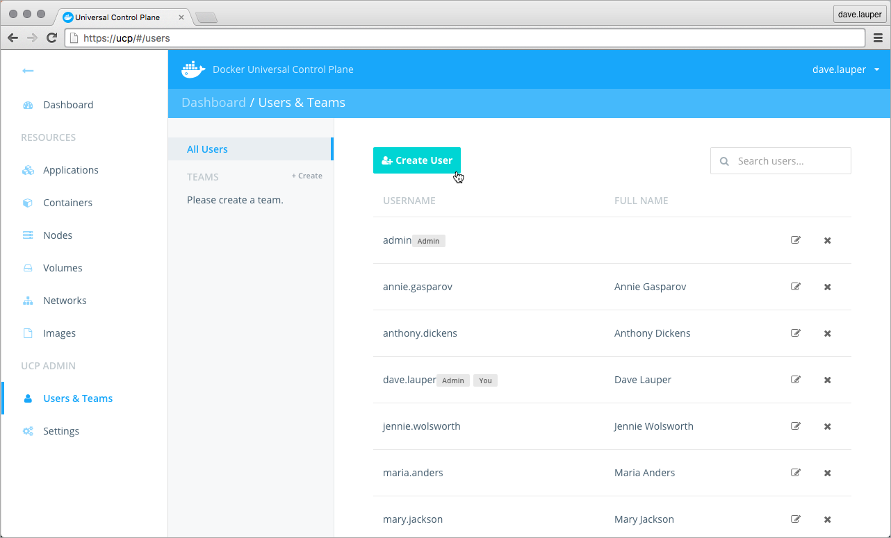 To create a new user, go to the UCP web UI, and navigate to the Users & Teams page.