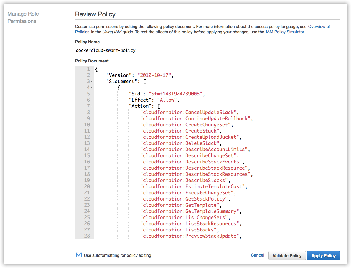 If you used Docker Cloud with AWS to deploy classic Node Clusters, you can add the new policy to your existing role by following the instructions below.