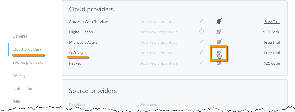 To link your SoftLayer account so you can launch nodes from Docker Cloud, navigate to Account info > Cloud Providers. Click Add credentials.