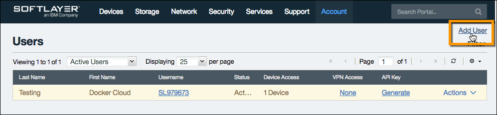 Although any SoftLayer account with the right privileges works, we recommend creating a new dockercloud-user user. If you have already created a service user, or do not wish to do so, continue to Add SoftLayer Account Credentials.