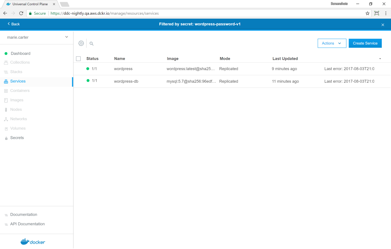- Navigate to the Services page and click Create Service. Name the service "wordpress-db", and for the Task Template, use the "mysql:5.7" image.