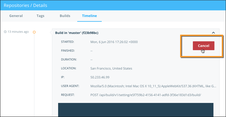 You can click the Cancel button for pending builds and builds in progress. If a build fails, the cancel button is replaced by a Retry button.