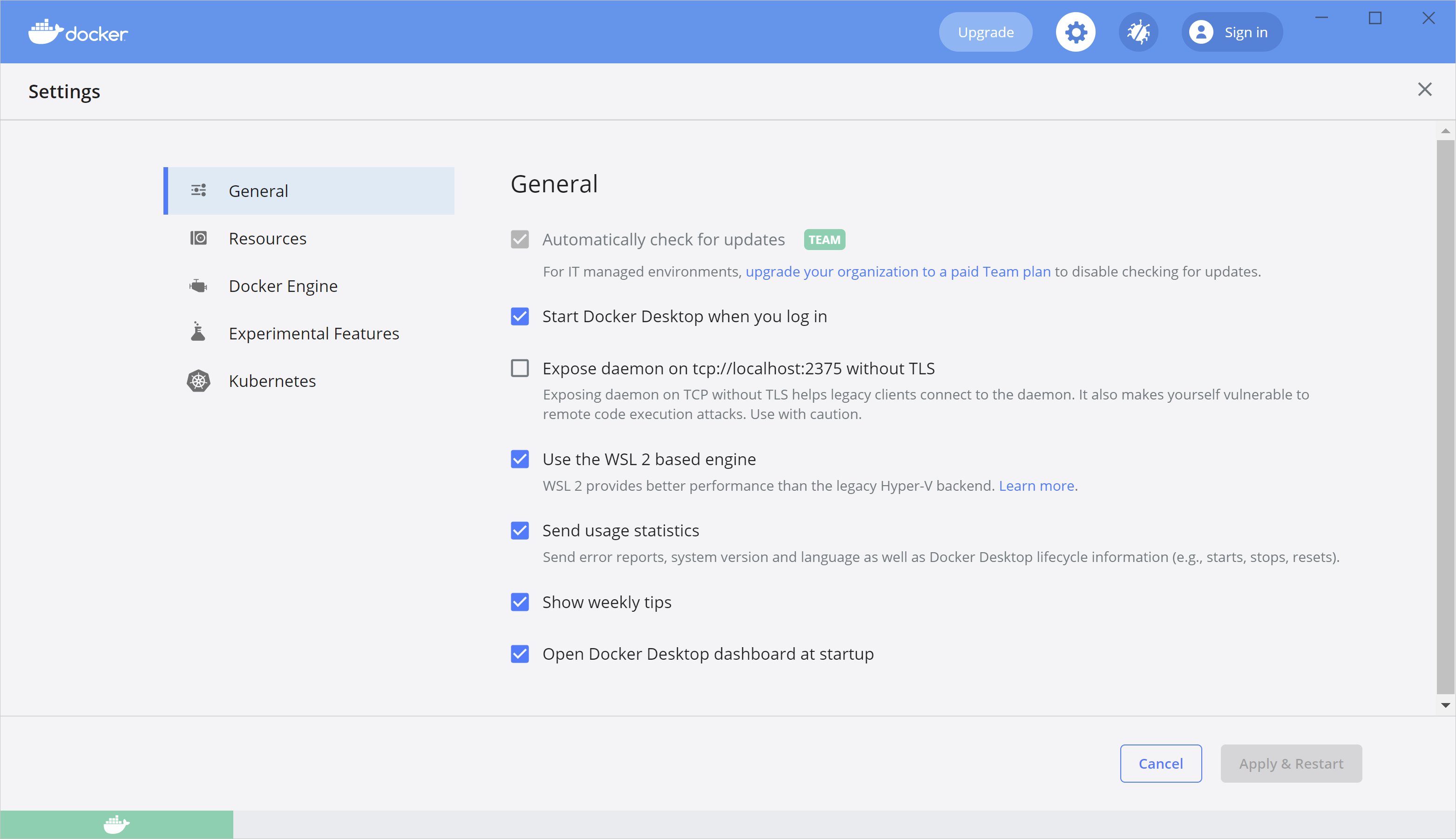 Automatically check for updates: By default, Docker Desktop is configured to check for newer versions automatically. If you have installed Docker Desktop as part of an organization, you may not be able to update Docker Desktop yourself. In that case, upgrade your existing organization to a Team plan and clear this checkbox to disable the automatic check for updates.