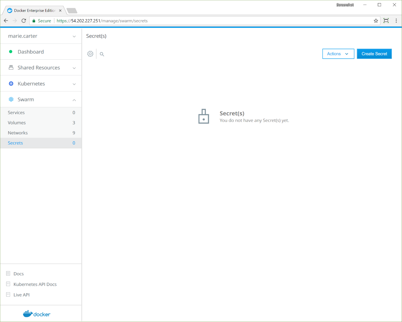 In the UCP web UI, open the Swarm section and click Secrets.
