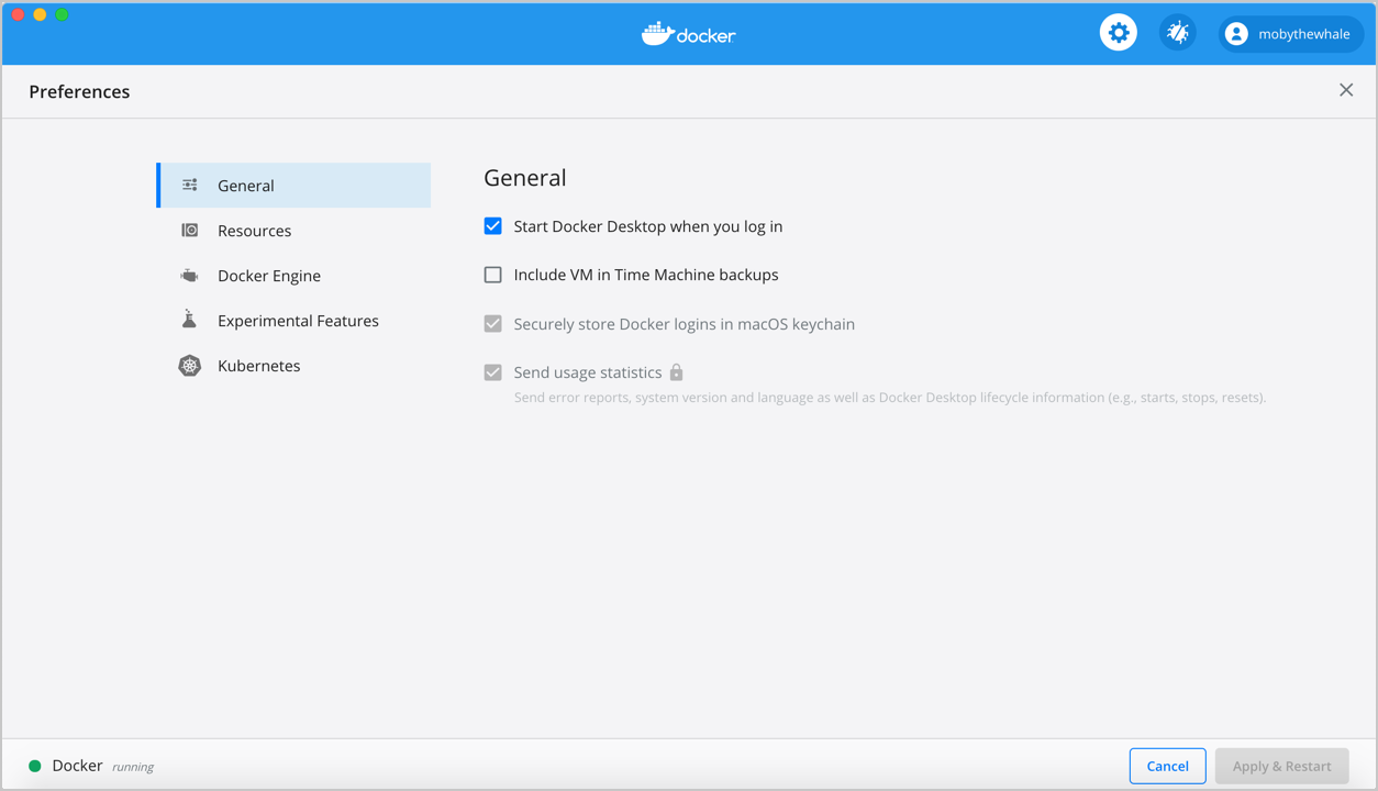 The Docker Preferences menu allows you to configure your Docker settings such as installation, updates, version channels, Docker Hub login, and more.