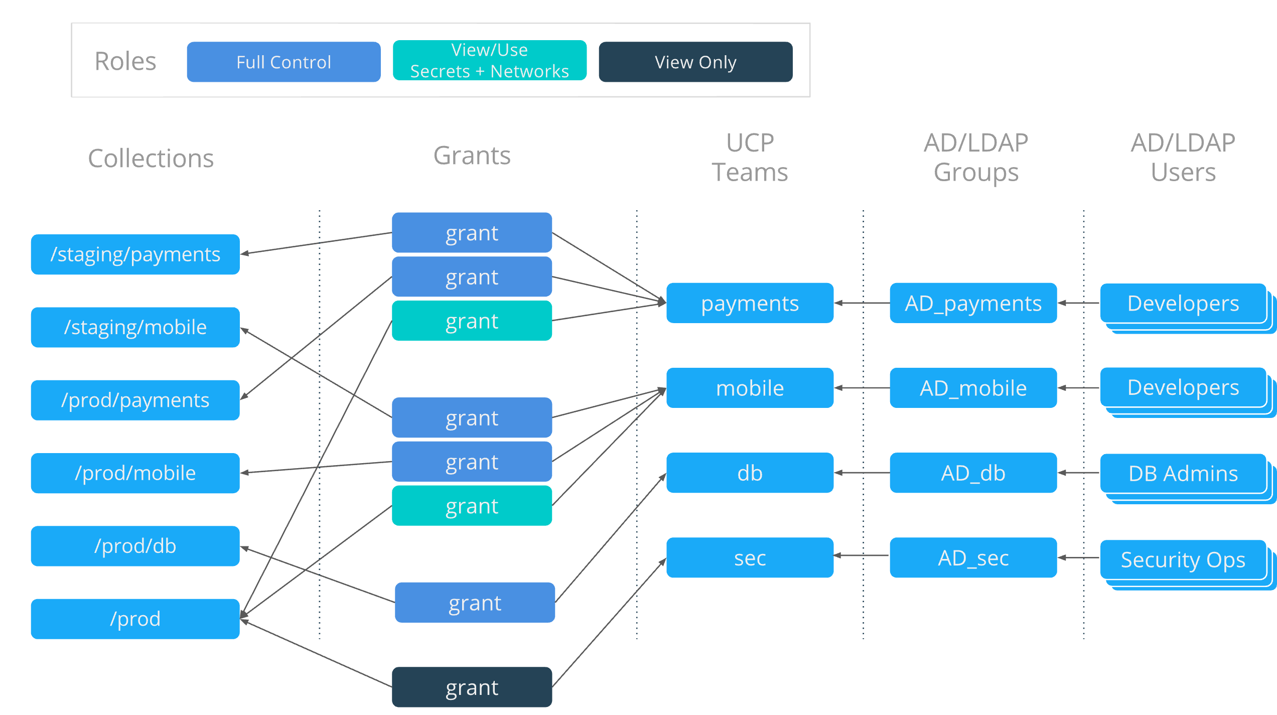 View Only(default role) allows users to see but not edit all Swarm resources.Full Control(default role) allows users complete control of all collections granted to them. They can also create containers without restriction but cannot see the containers of other users.View & Use Networks + Secrets(custom role) enables users to view/connect to networks and view/use secrets used bydbcontainers, but prevents them from seeing or impacting thedbapplications themselves.