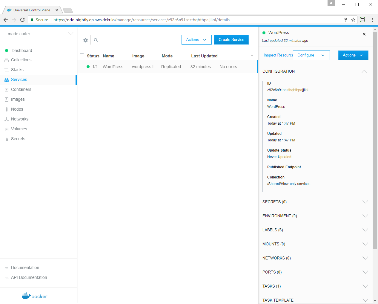 wordpress:latest. This identifies the most recent WordPress image in the Docker Store. - In the left pane, click Collection. The Swarm collection appears.