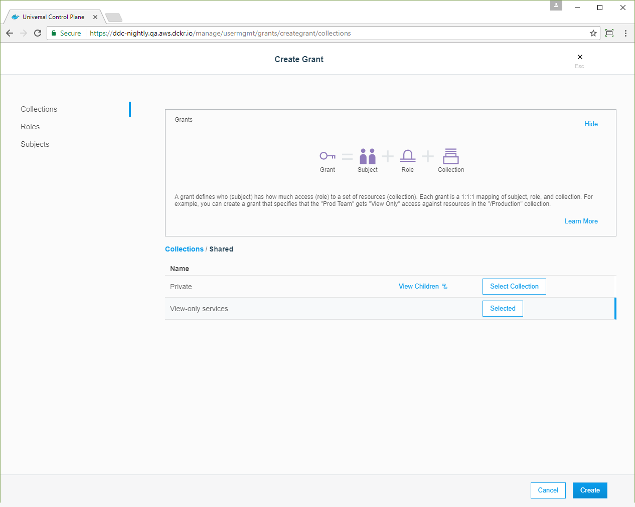 In this example, your organization is granted access to a new resource collection that contains one Swarm service.