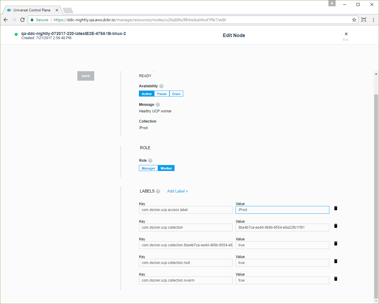com.docker.ucp.access.labeland change its value from/Sharedto/Prod. - Click Save to move the node to the