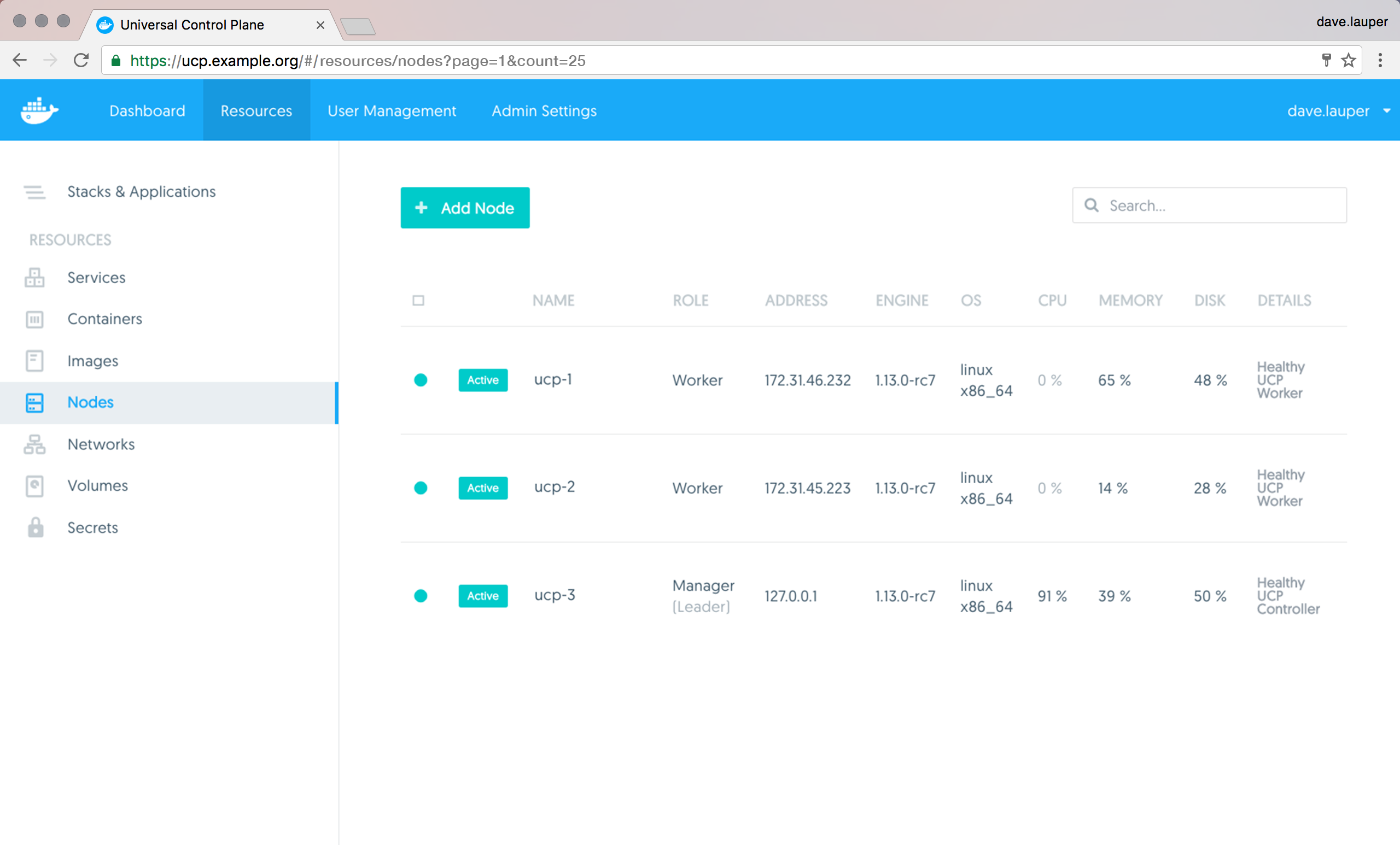 Join more nodes so that you can manage them from UCP. Go to the UCP web UI, navigate to the Resources page, and go to the Nodes section.