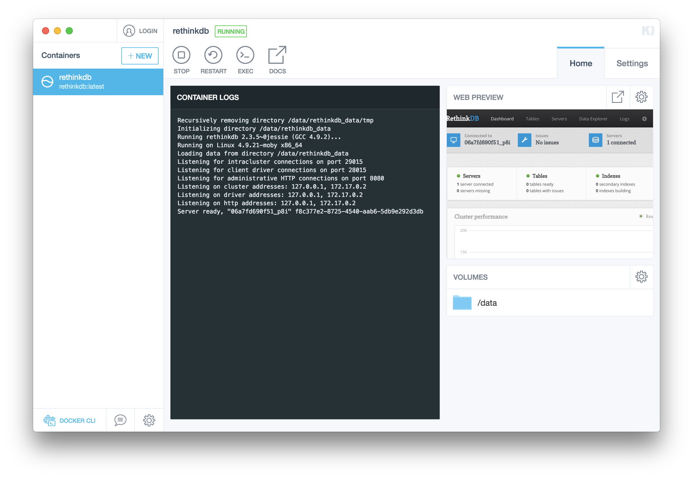 successfully used a RethinkDB container in Kitematic to build a real-time chat
