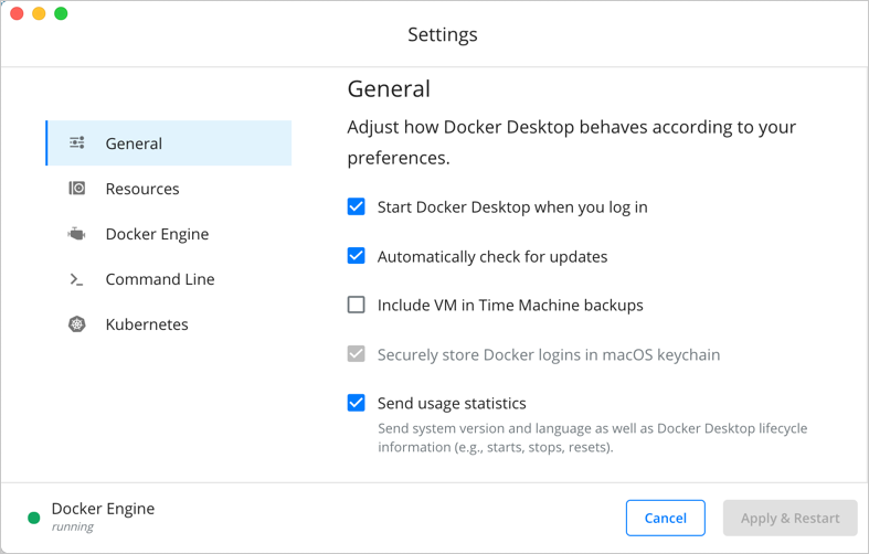 Send usage statistics: Docker Desktop sends diagnostics, crash reports, and usage data. This information helps Docker improve and troubleshoot the application. Clear the check box to opt out.