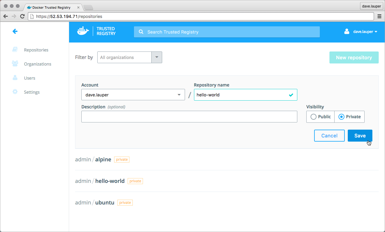 Navigate to the DTR web UI, and create a new hello-world repository so that you can push and pull images. Set it as private, and save the changes.