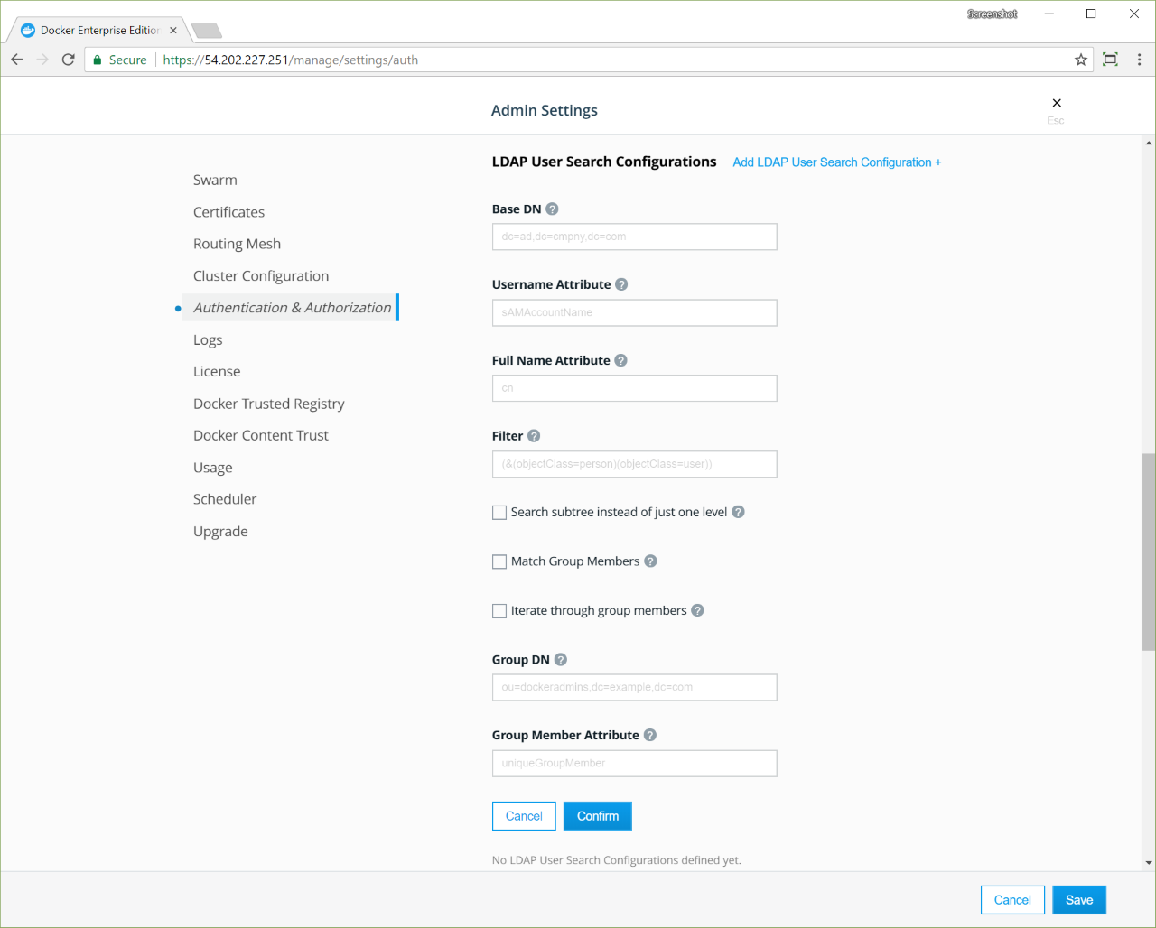 Access LDAP settings by navigating to the Authentication & Authorization page in the UCP web interface. There are two sections for controlling LDAP searches and servers.
