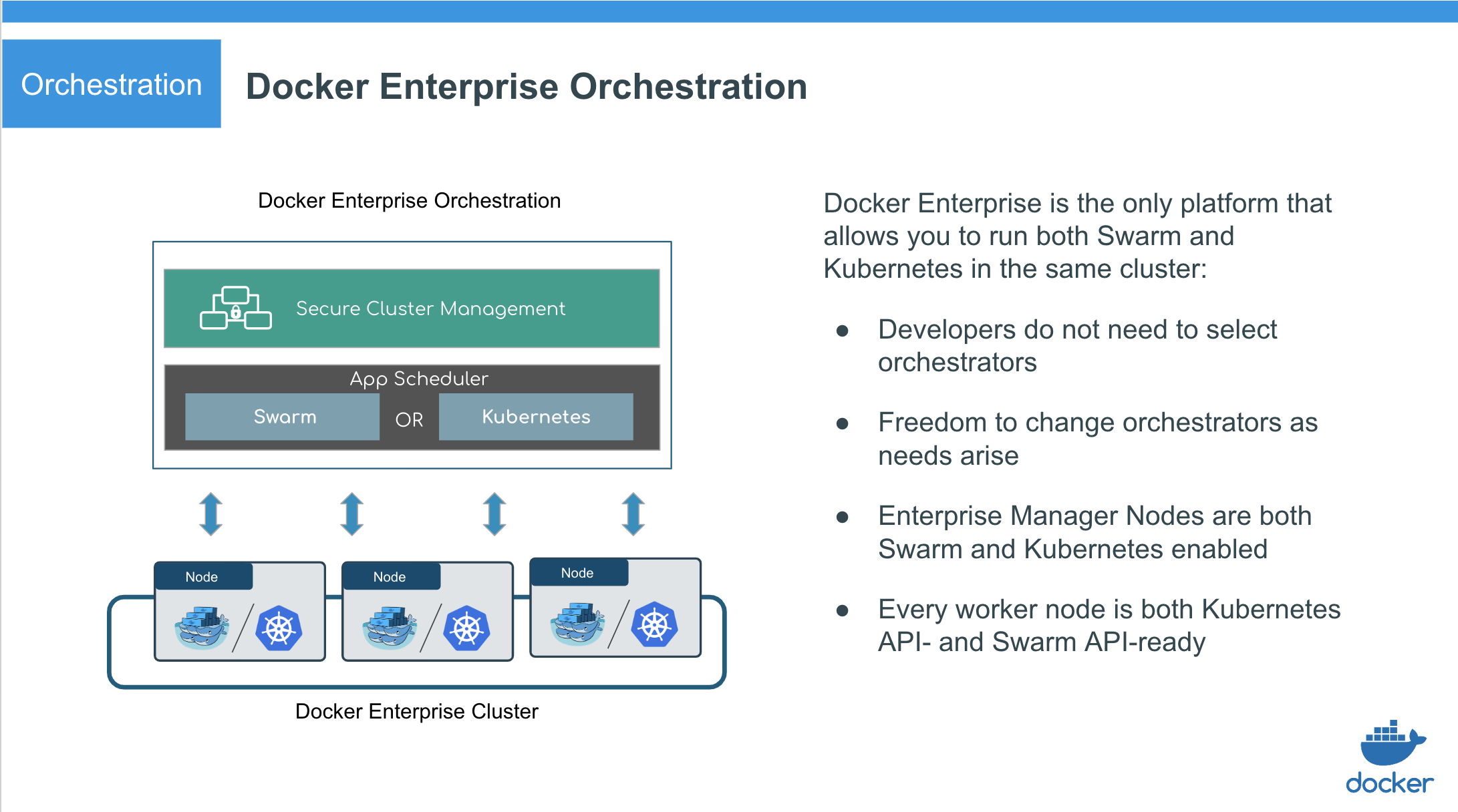 • Docker Enterprise manager nodes are both Swarm managers and Kubernetes masters, to enable high availability