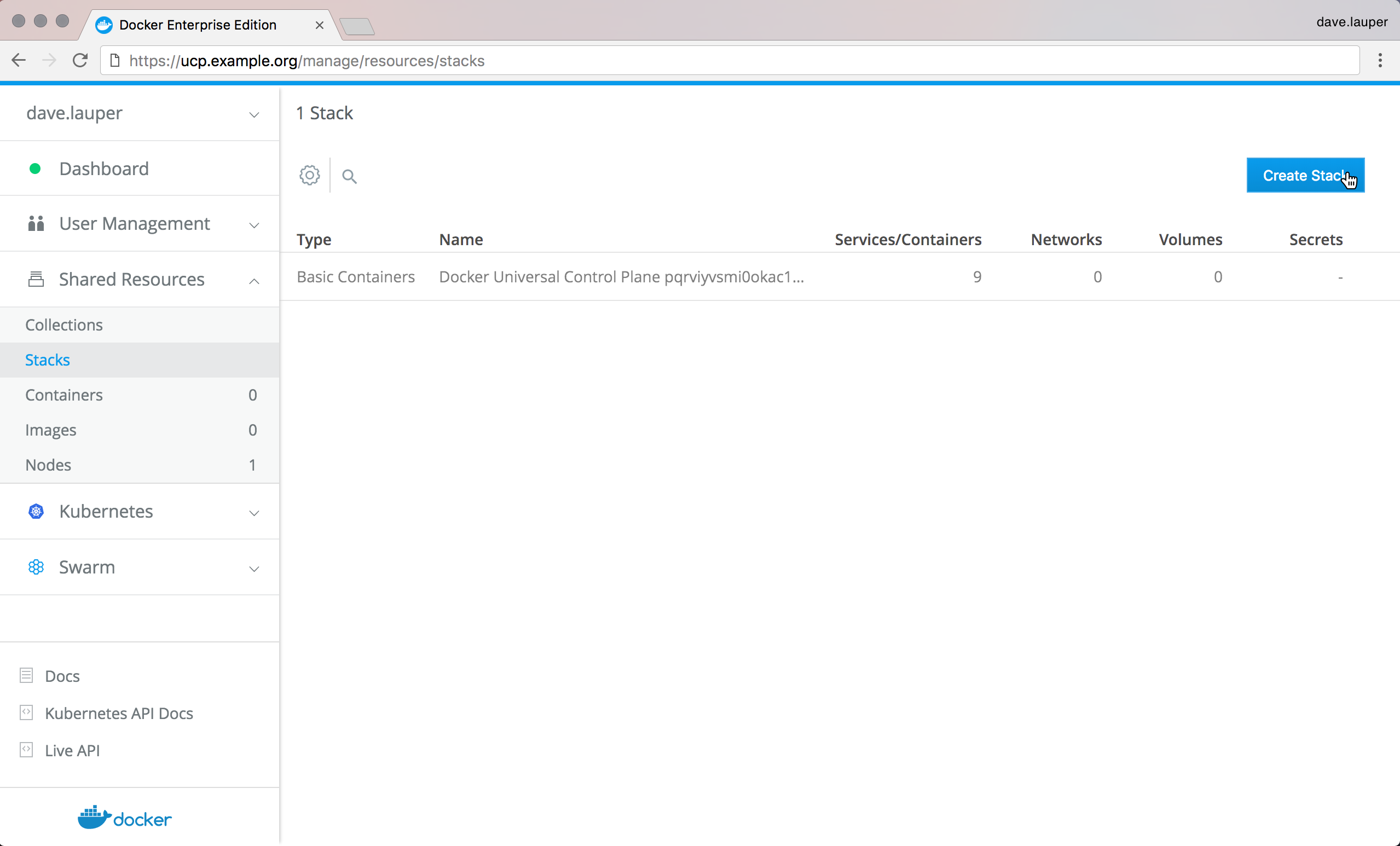 To deploy your applications from the UCP web UI, on the left navigation bar expand Shared resources, choose Stacks, and click Create stack.