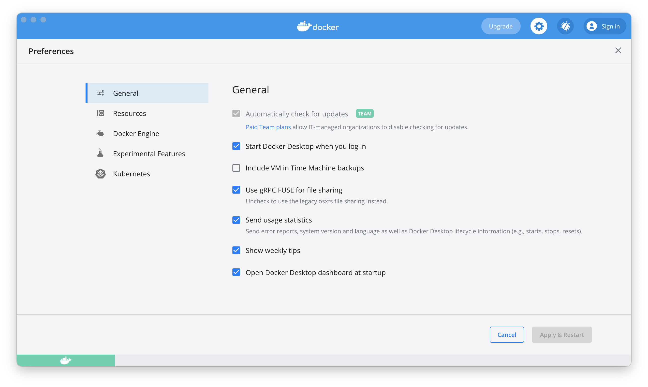 Automatically check for updates: By default, Docker Desktop is configured to check for newer versions automatically. If you have installed Docker Desktop as part of an organization, you may not be able to update Docker Desktop yourself. In that case, upgrade your existing organization to a Team plan and clear this checkbox to disable the automatic check for updates.