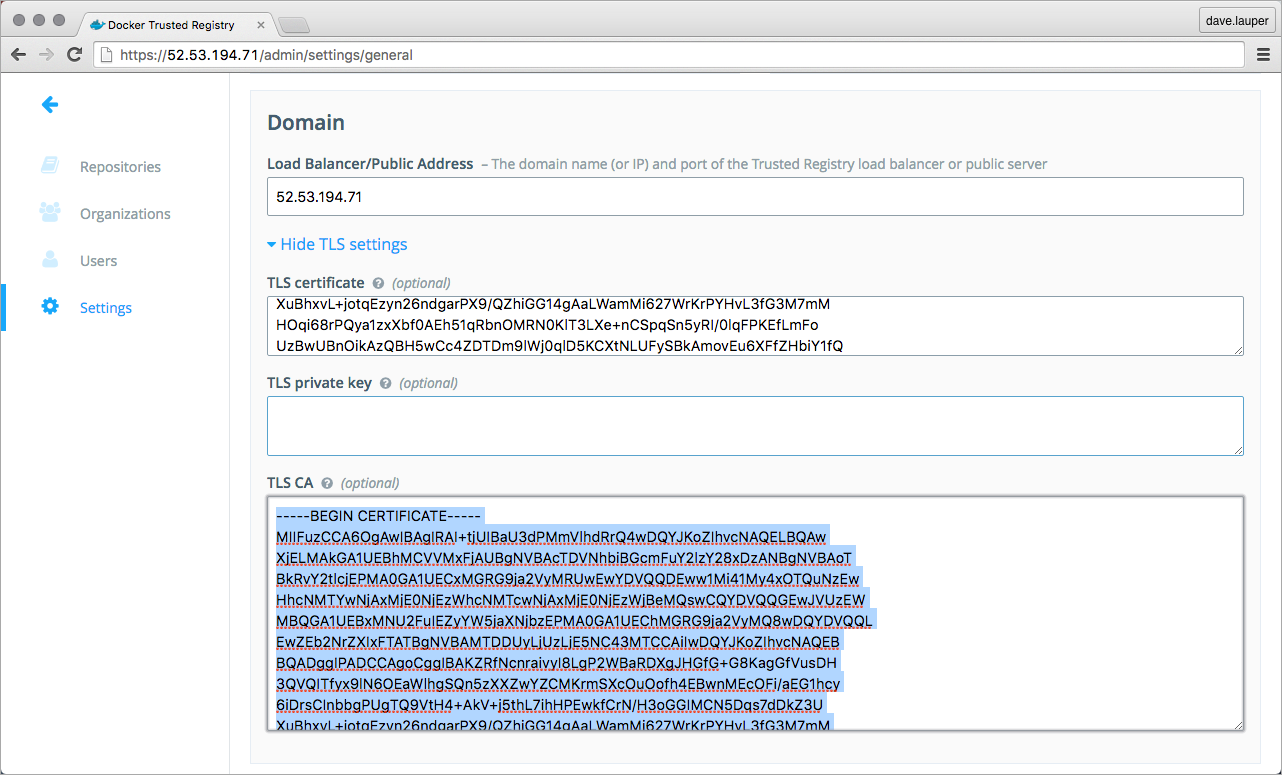 dtr-ca.pemfile.If your Docker Trusted Registry is configured to use a certificate issued by a third-party root CA, you can skip this step, because UCP will trust the CA that issued the certificate.