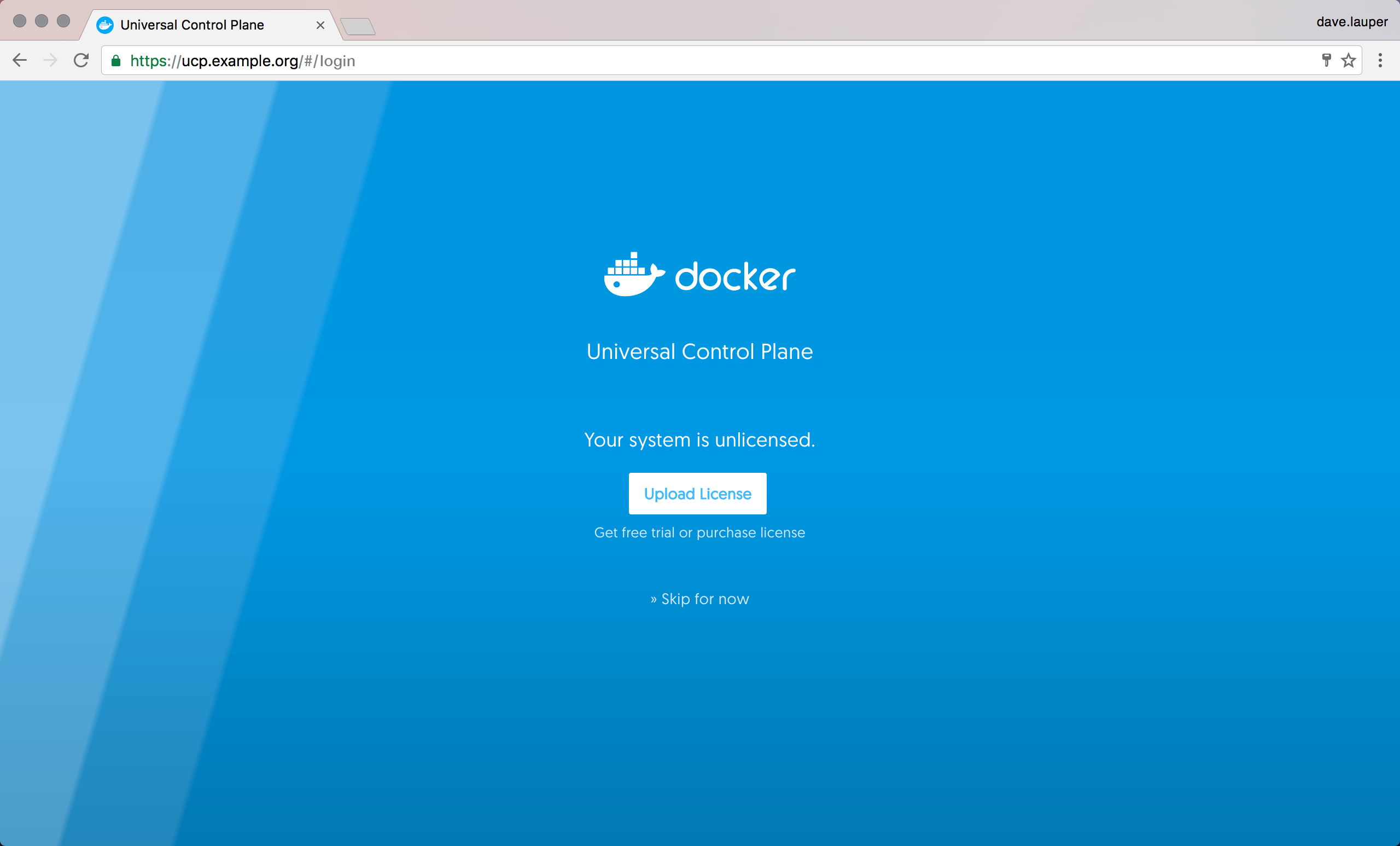Now that UCP is installed, you need to license it. In your browser, navigate to the UCP web UI, log in with your administrator credentials and upload your license.