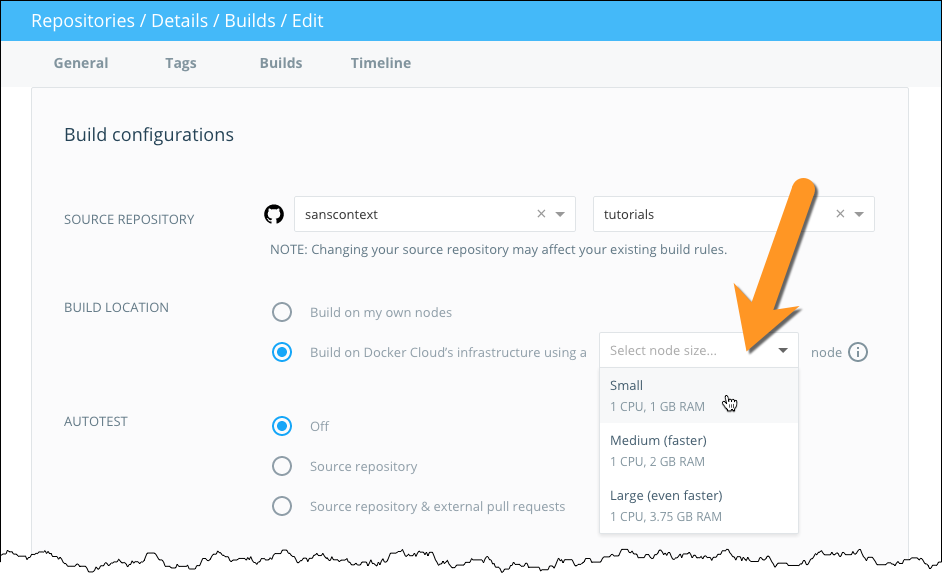 You can either run the process on your own infrastructure and optionally set up specific nodes to build on, or you can use the hosted build service offered on Docker Cloud's infrastructure. If you use Docker's infrastructure, select a builder size to run the build process on. This hosted build service is free while it is in Beta.