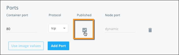 For this tutorial leave the Node port set to dynamic. This means that port 80 of the container is mapped to a random available port in the node in which the container is deployed. To force a specific port in the node, click dynamic and specify a port.