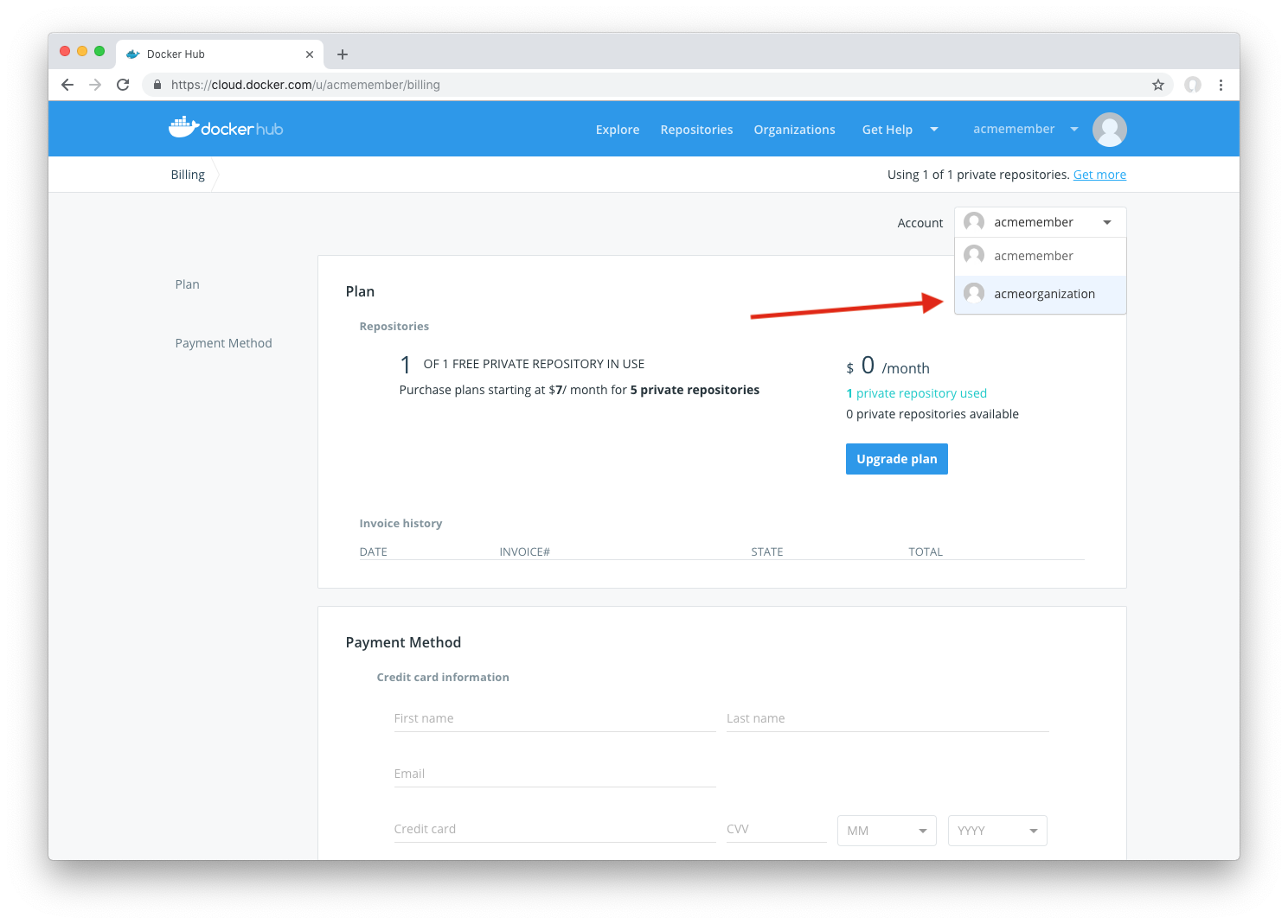 User and organization accounts maintain separate Docker Hub billing profiles.