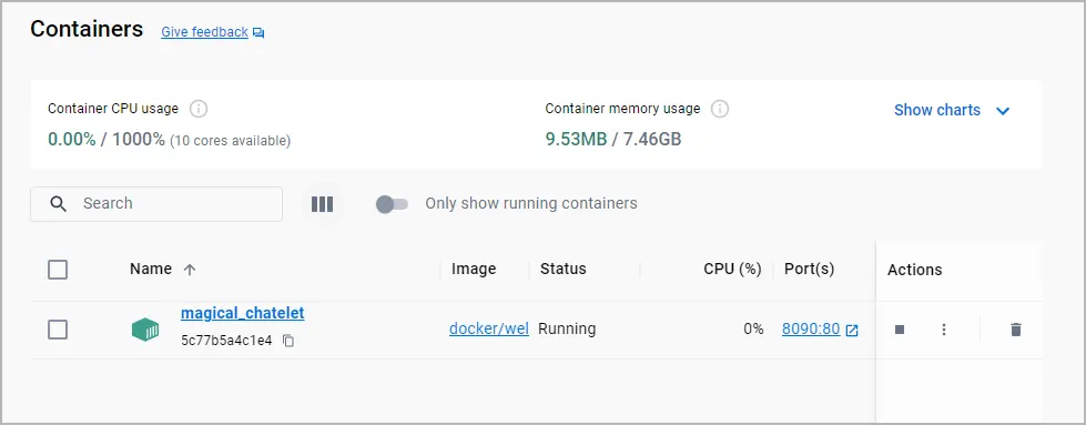 That's it! The container is ready to use. Go to the Containers tab in Docker Desktop to view the container.