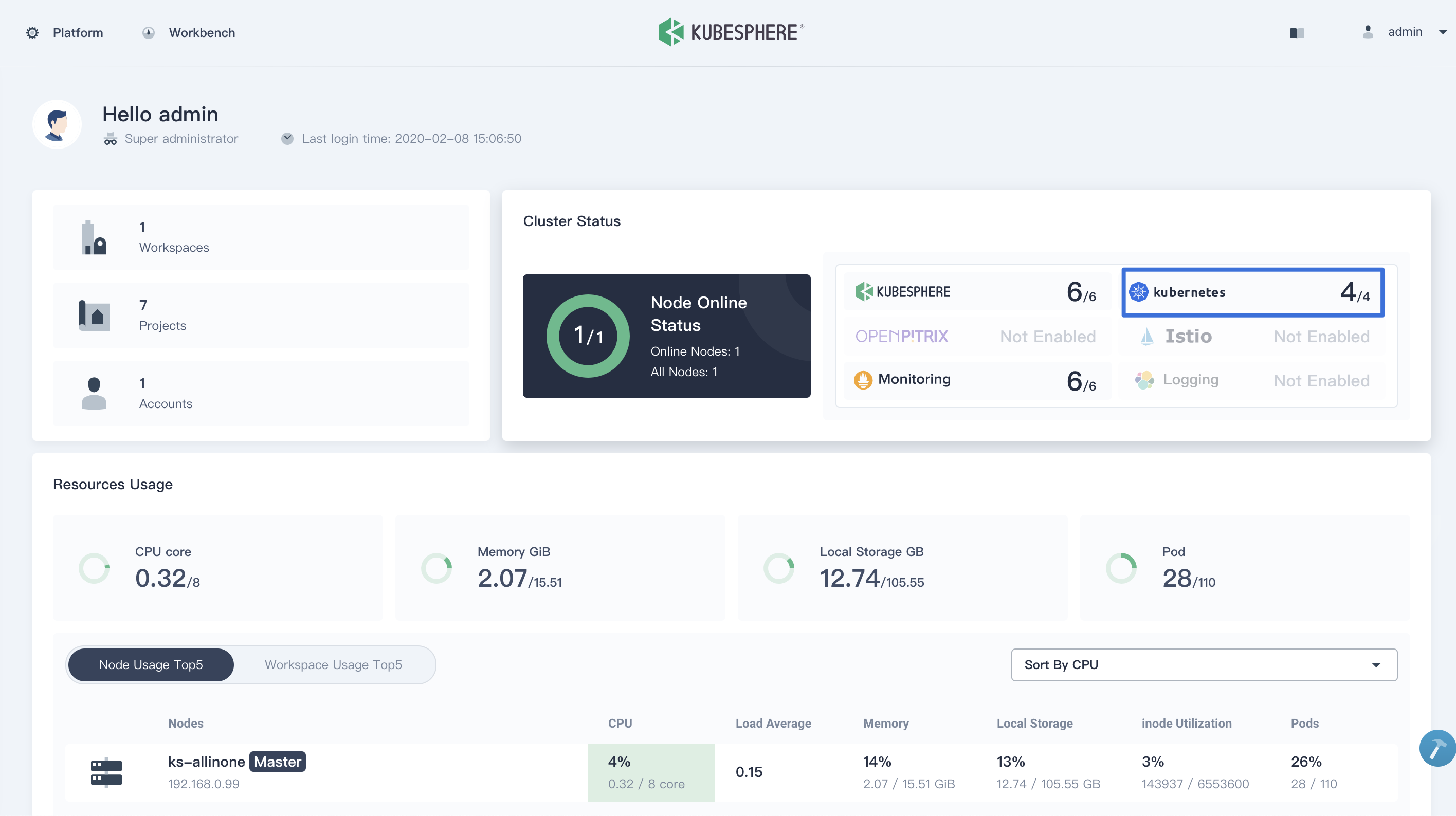 {{< tip >}} KubeSphere 提供了 All-in-One 和 Multi-node 两种模式的安装。 这使得 Kubernetes 和 Istio 可以在一个统一的 Web 控制台中进行快速设置和管理。 详细信息请参考 Multi-node Installation {{< /tip >}}