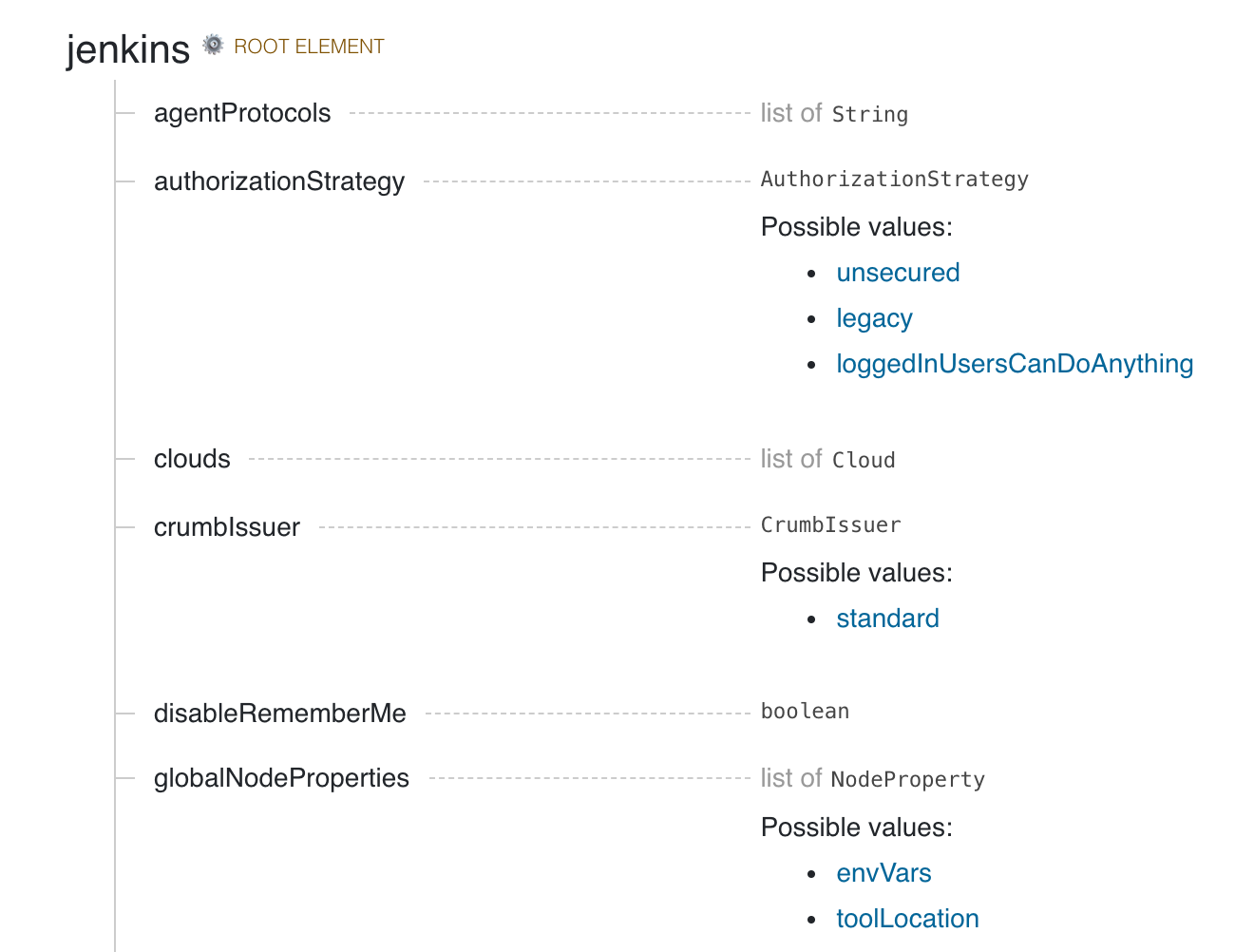 The below configuration file includes root entries for various components of your primary Jenkins installation. The jenkins one is for the root Jenkins object, and the other ones are for different global configuration elements.