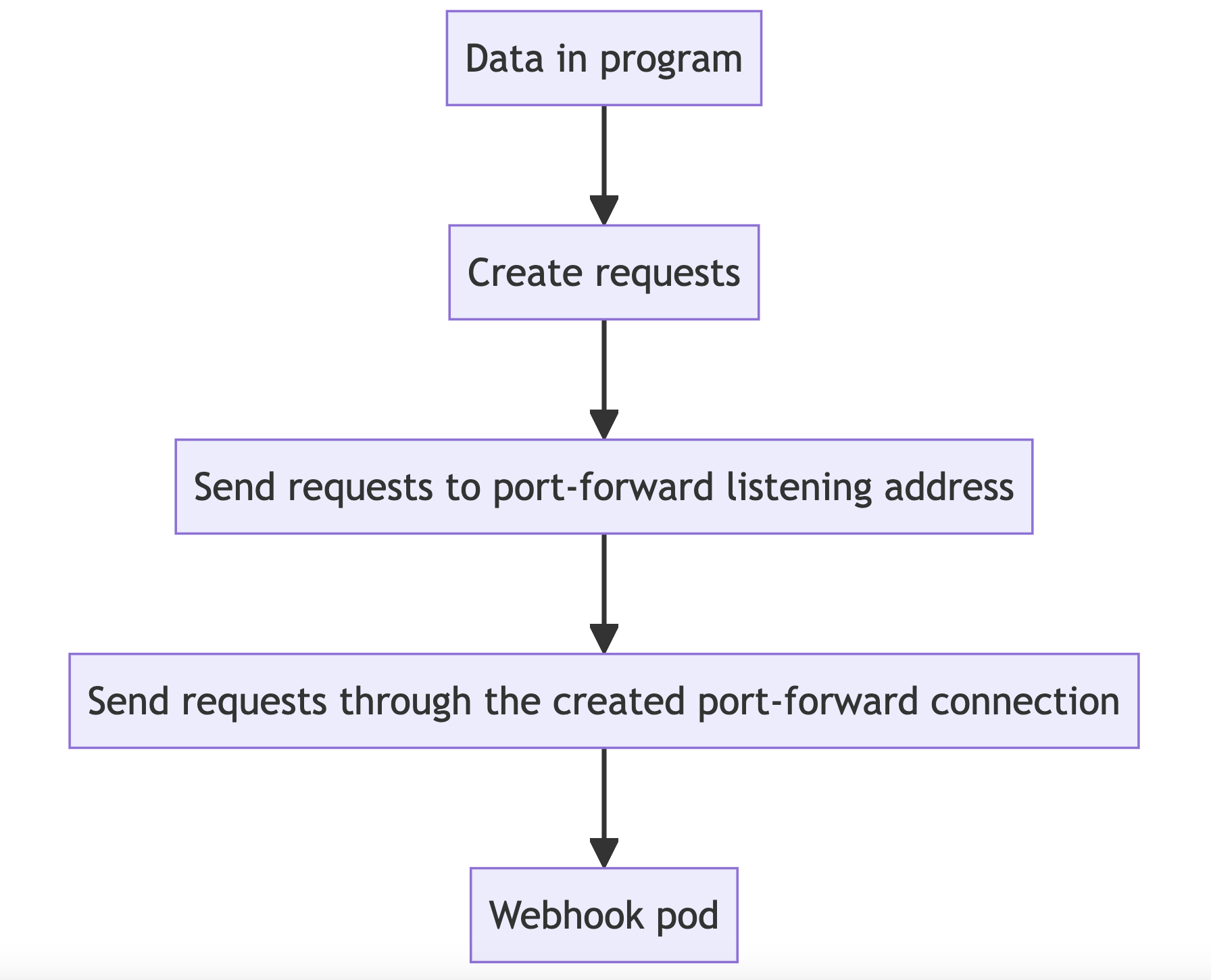In this approach, data is also generated within a program. The program then creates requests, which are sent to the webhook pod through a port-forward connection.