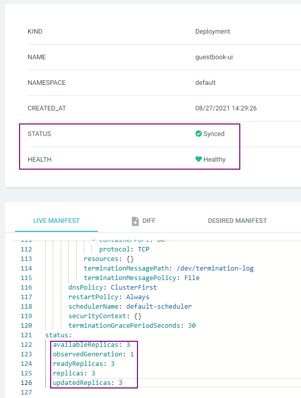 You can obtain the aggregated status of the Deployment from UI by deploy/guestbook-ui