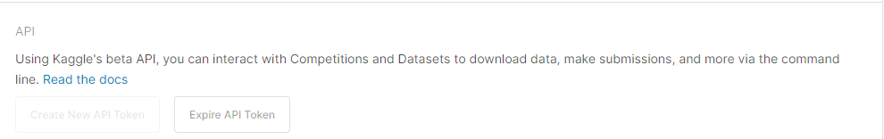 - If you are not a Kaggle user, you will first need to create a Kaggle account. After creation of the account, go to your Kaggle Account page and scroll down to API section.