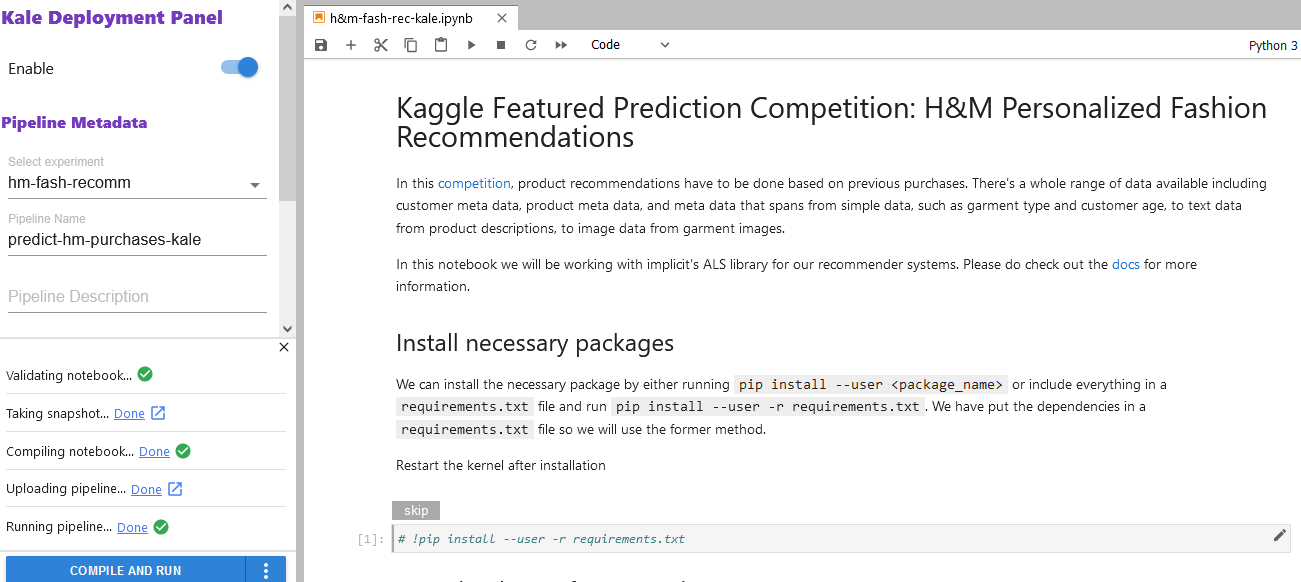 Once you’ve tagged your notebook, click on the “Compile and Run” button in the Kale widget. Kale will perform the following tasks for you: