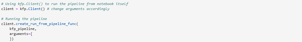 There are different ways to run the pipeline function as mentioned in the documentation. We would run the pipeline using the Kubeflow Pipelines SDK client.