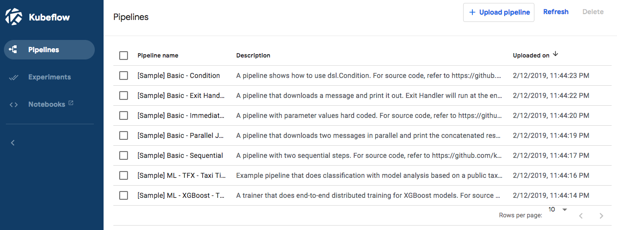 Now that you have the compiled pipelines file, you can upload it through the Kubeflow Pipelines UI. Simply select the "Upload pipeline" button