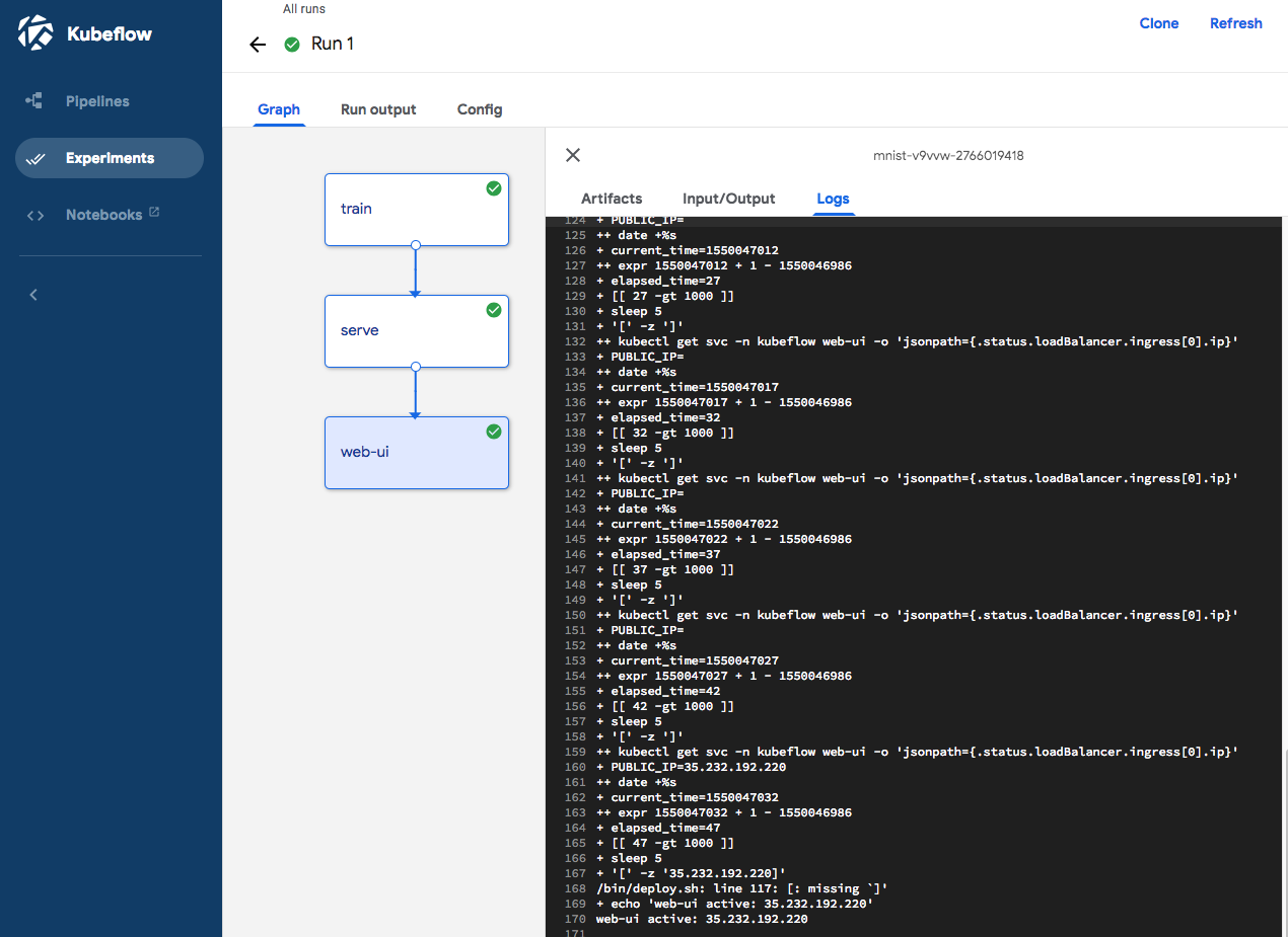 After clicking on the newly created Run, you should see the pipeline run through the 'train', 'serve', and 'web-ui' components. Click on any component to see its logs. When the pipeline is complete, look at the logs for the web-ui component to find the IP address created for the MNIST web interface