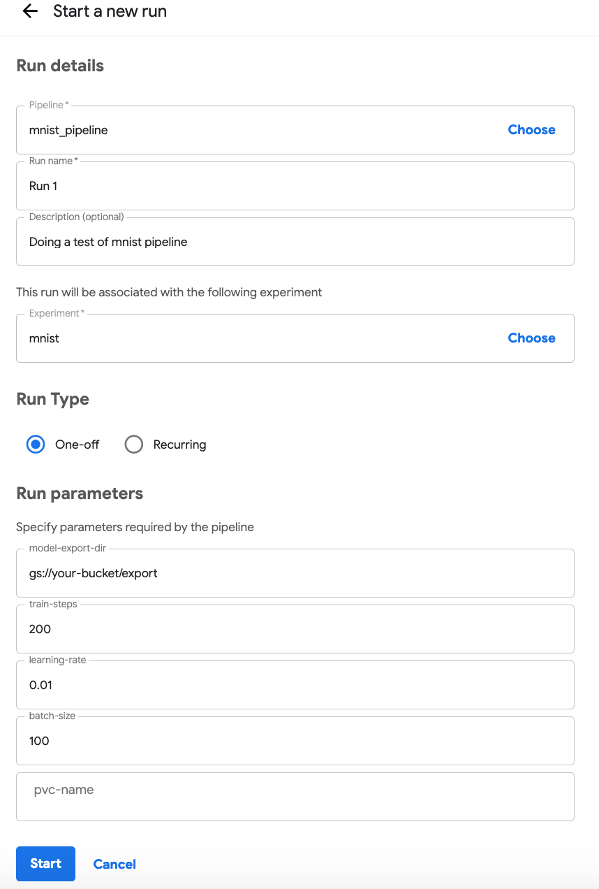 The pipeline is defined in the mnist_pipeline function. It includes a number of arguments, which are exposed in the Kubeflow Pipelines UI when creating a new Run.