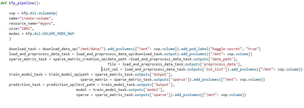 After building all the pipeline components, we have to define a pipeline function connecting all the pipeline components with appropriate inputs and outputs. This when run would generate the pipeline graph.