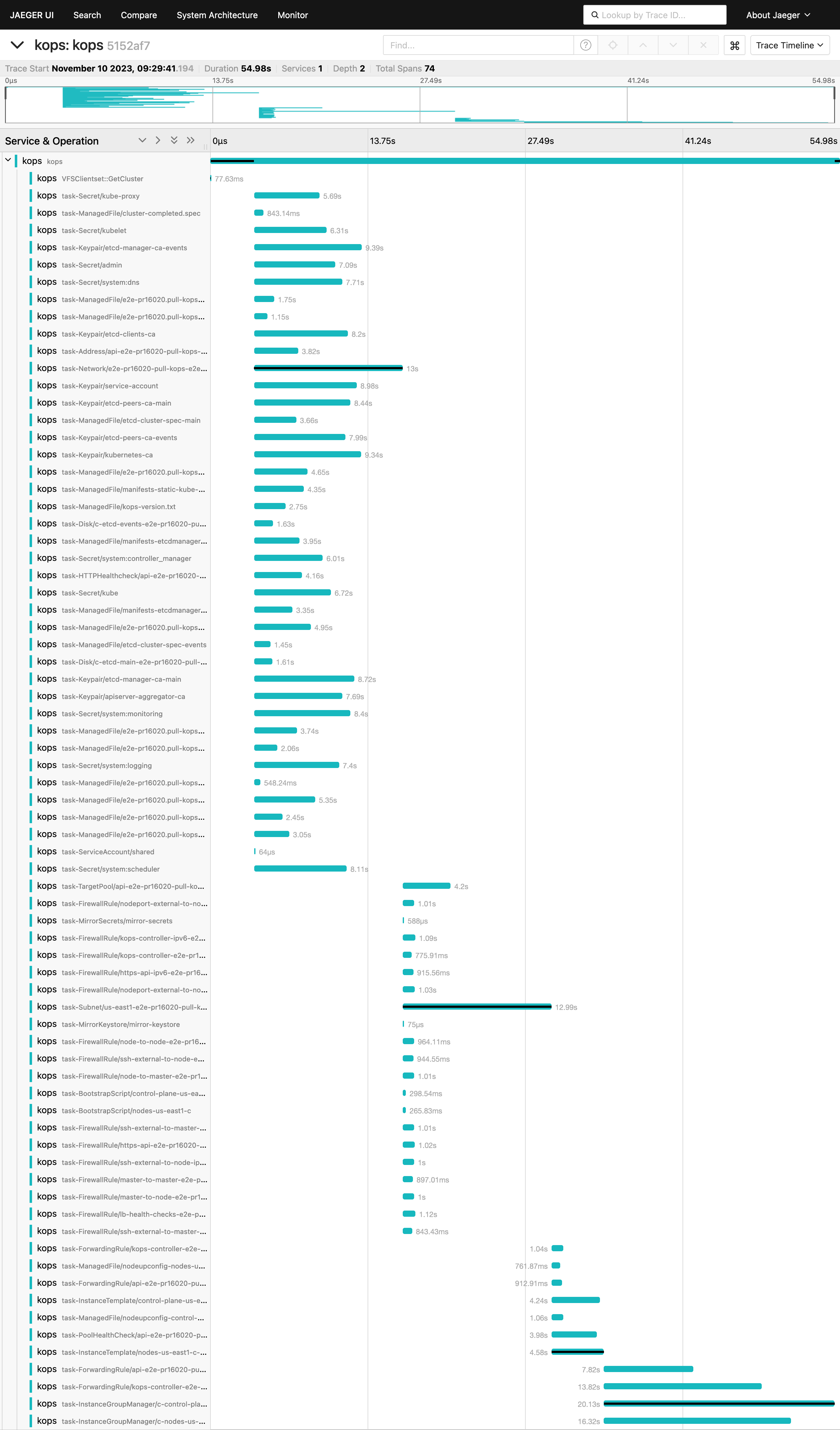 kOps supports a "serverless" mode of operation, where it logs the OpenTracing output to a file. We do this because our e2e test runner (prow) doesn't yet have a destination for OpenTelemetry data.