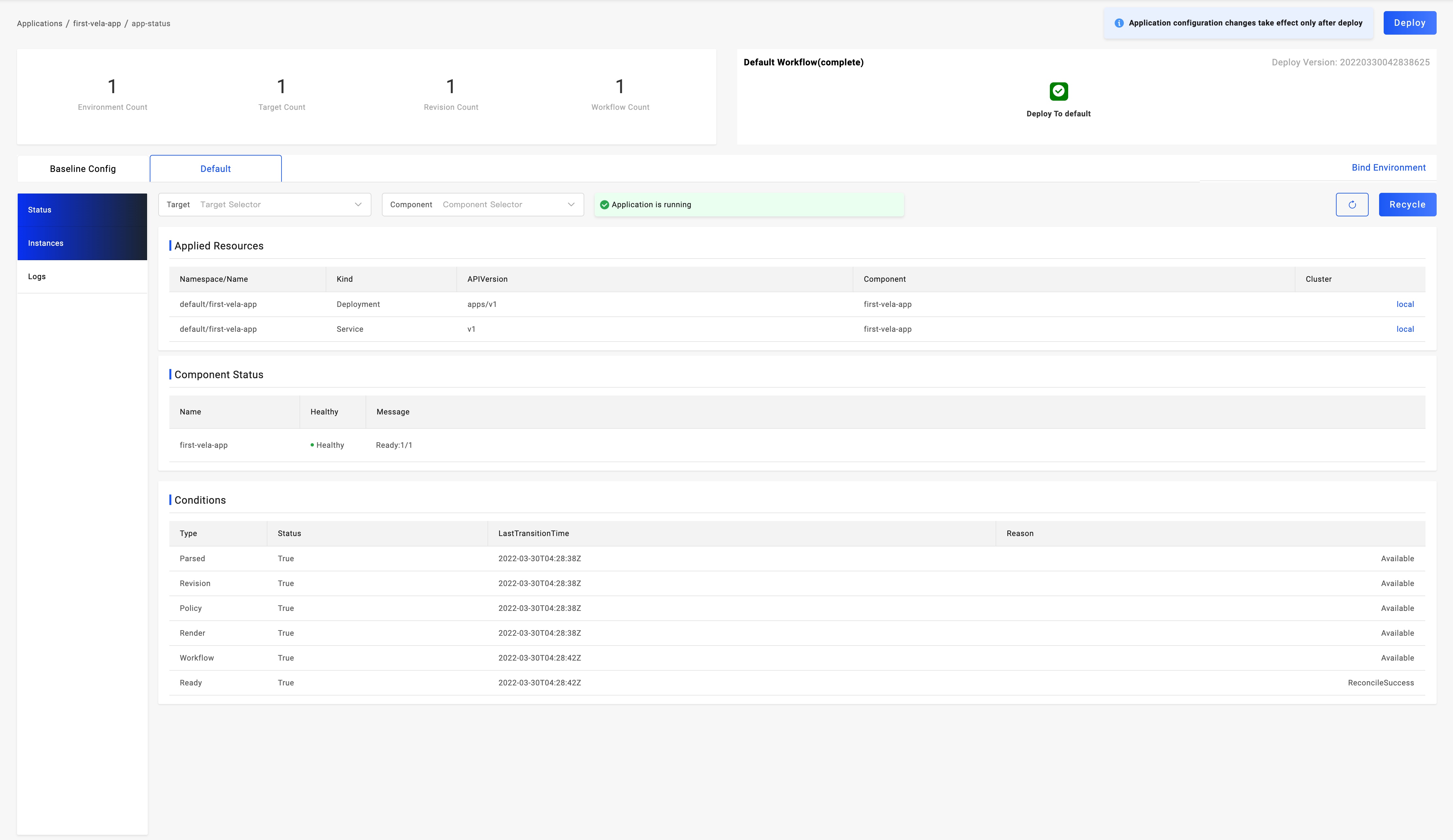 确认创建后即可完成应用配置,控制台创建的应用默认会根据所选环境生成 工作流 和一个设置副本数的 运维特征