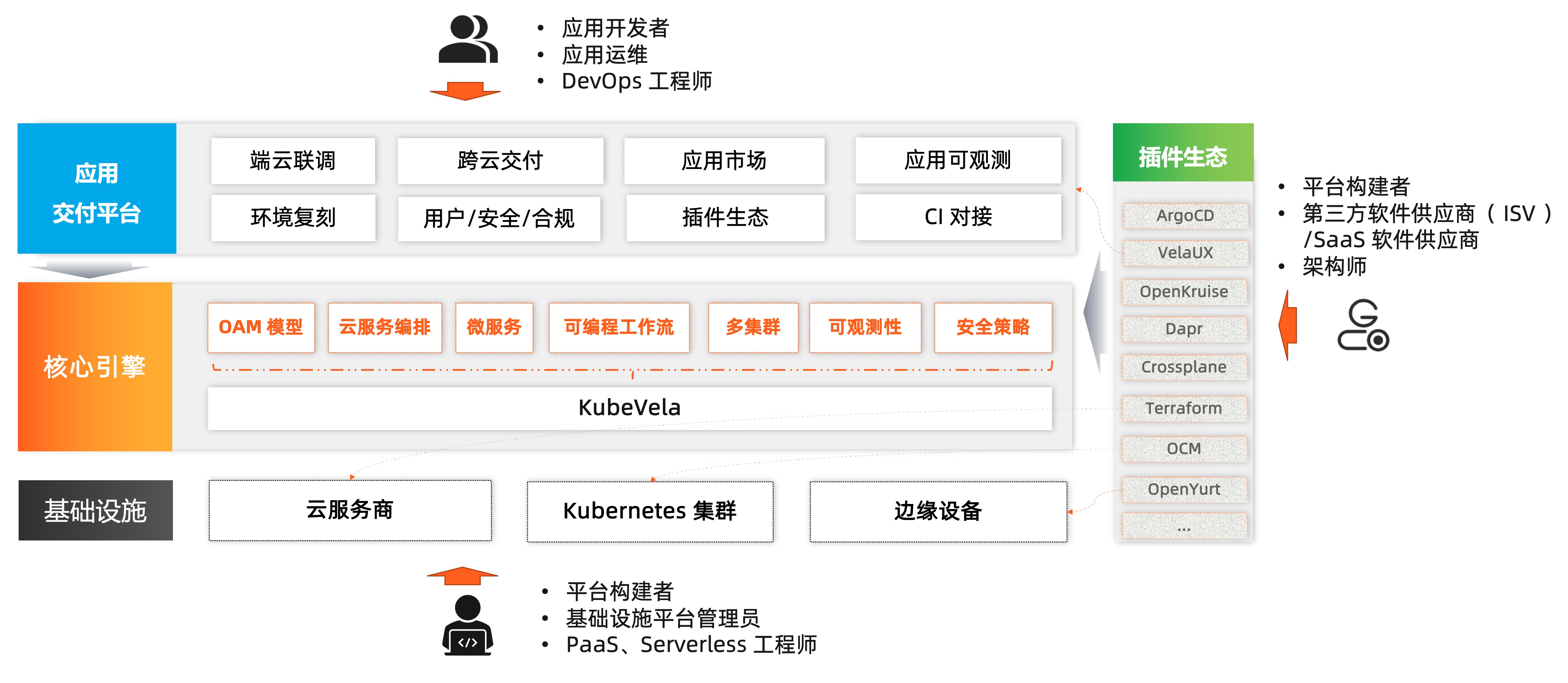 - UI 控制台和 CLI UI 控制台服务于希望开箱即用的开发者用户,CLI 适用于集成 KubeVela 和终端管理的用户。