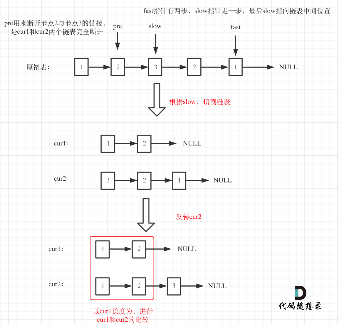 - 将后半部分反转 ,得cur2,前半部分为cur1