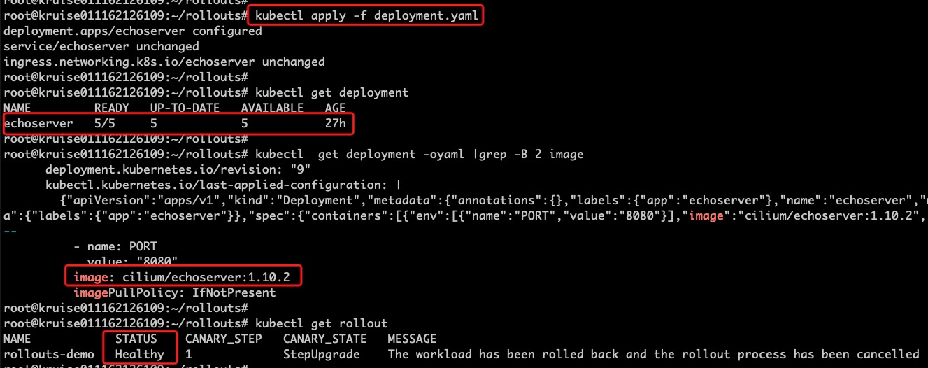 At this point, the rollout status remains at StepUpgrade state, and by checking the deployment and pods status, you can see that it is because the image pull failed.