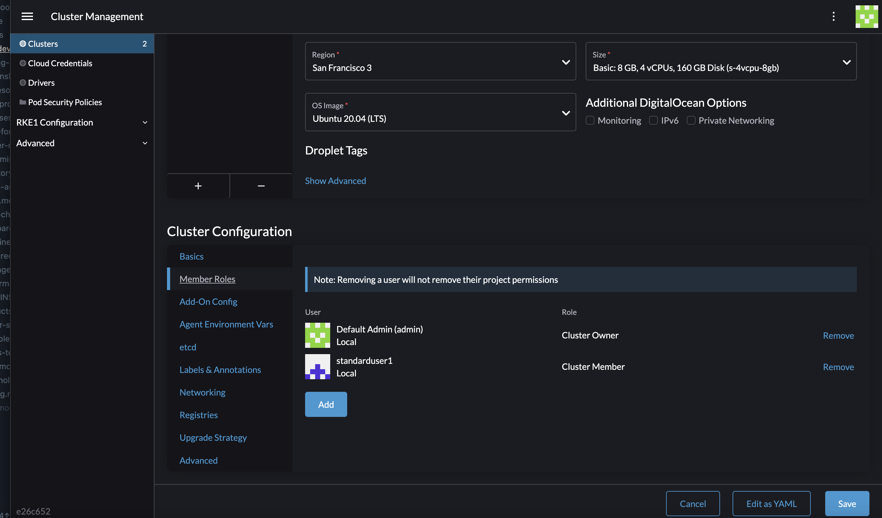 However, you can't assign someone to a cluster directly from the user list or detail views. To give a user access to a cluster, you have to navigate to a downstream cluster. You can add them from Edit Config for a cluster from the Cluster Management area, or you can add them from Cluster Explorer under Cluster > Cluster Members in the side nav.